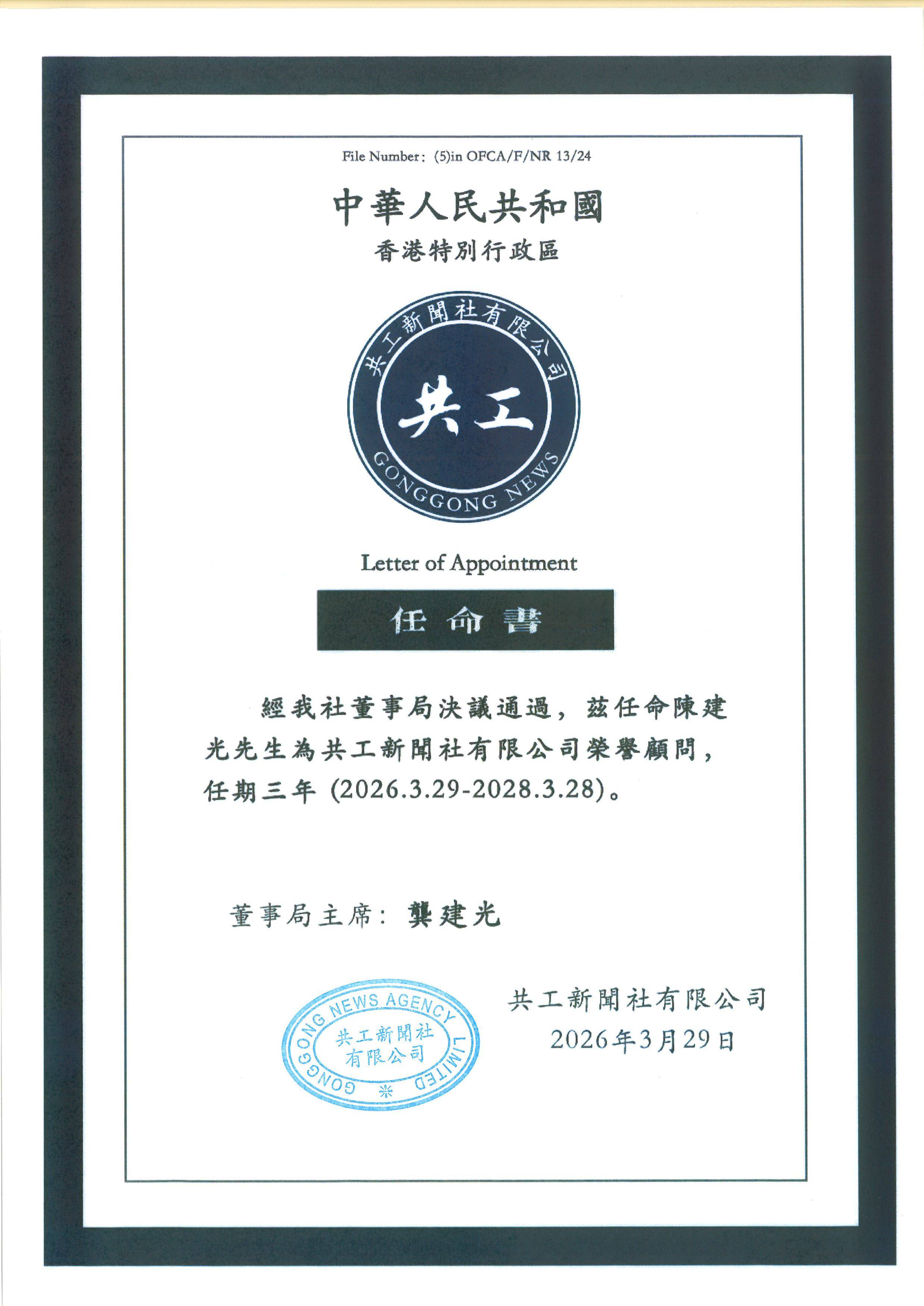 经共工新闻总社研究决定,台湾中华妇女党创党主席陈建光正式受聘担任共工新闻总社荣誉顾问。其任期自本通知发布之日起计算,为期三年。